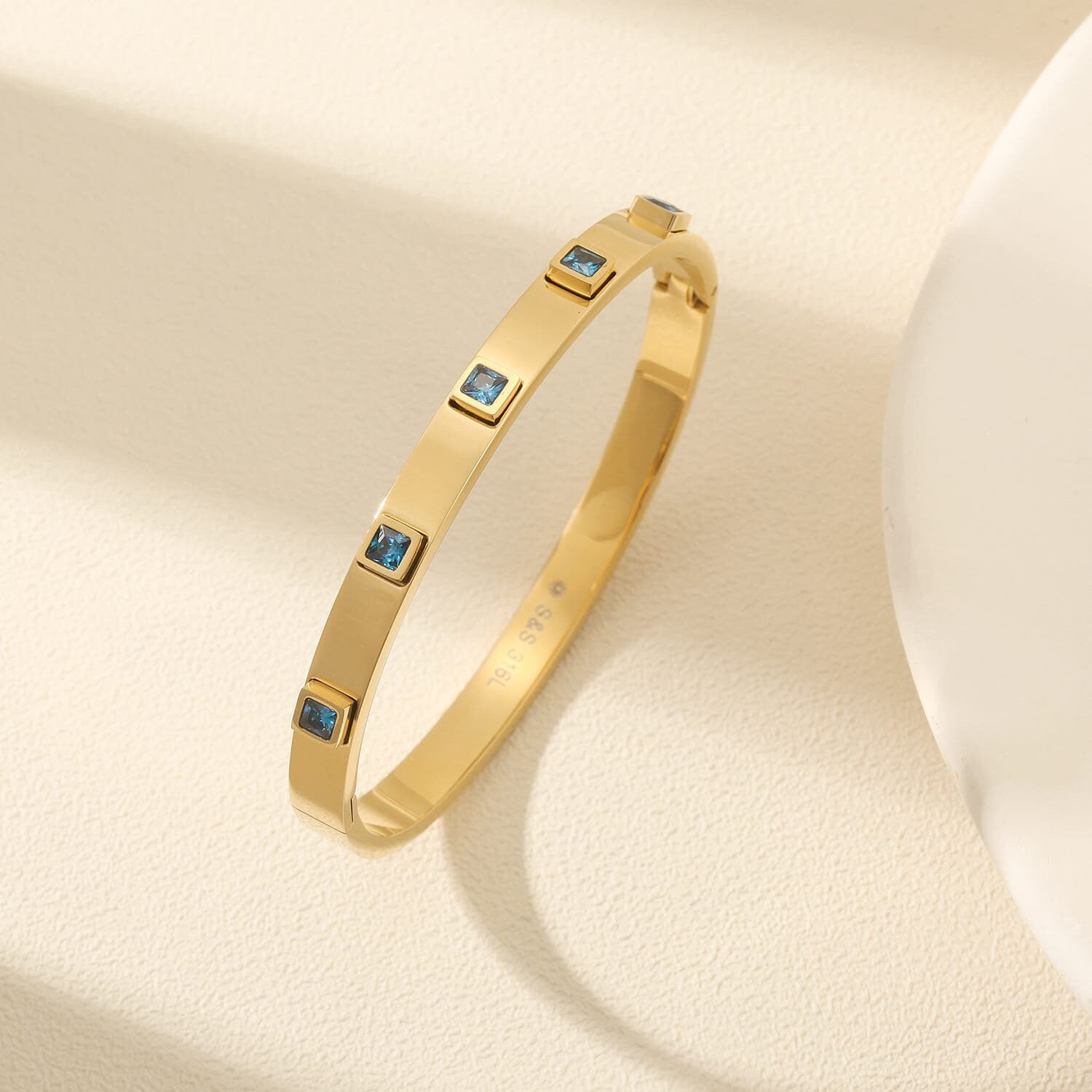 Elevate your everyday elegance with our Gemstone Accent Gold Bangle Bracelet—a timeless piece with a modern twist. Crafted in a sleek gold-tone finish, each bangle is adorned with brilliant square-cut gemstones that add a vibrant pop of color and luxury. Choose from a range of gemstone colors to match your mood, style, or stack them for a bold statement.