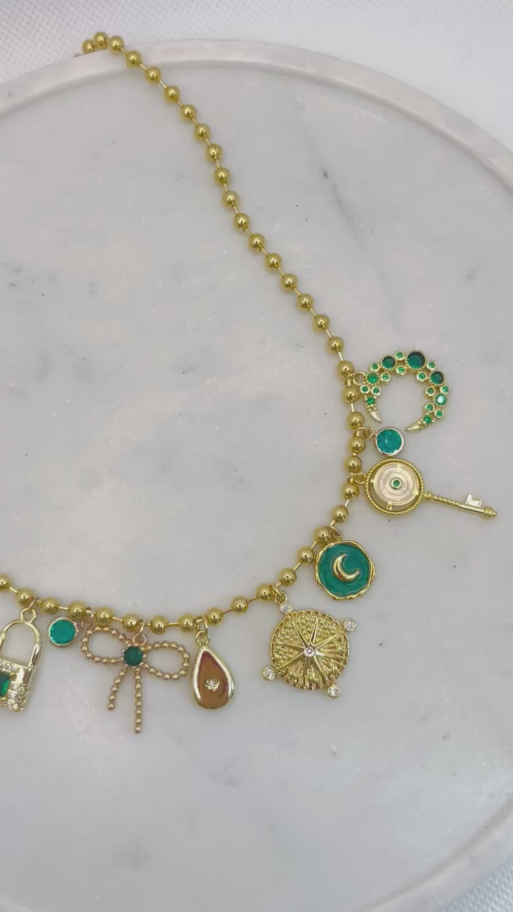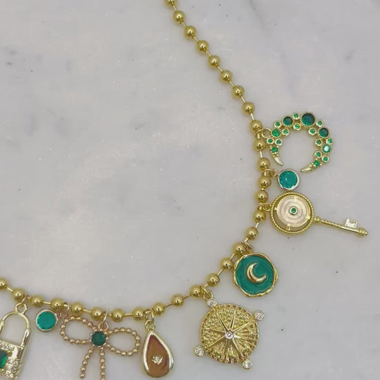 Make a statement with this exquisite Emerald Luxe Charm Necklace from So Precious by Karem. Featuring a radiant gold beaded chain adorned with a curated selection of meaningful charms, this necklace blends elegance with symbolism. Each charm tells a story — from the sparkling lock and key of protection and new beginnings, to the celestial moon and compass symbolizing guidance, luck, and destiny.