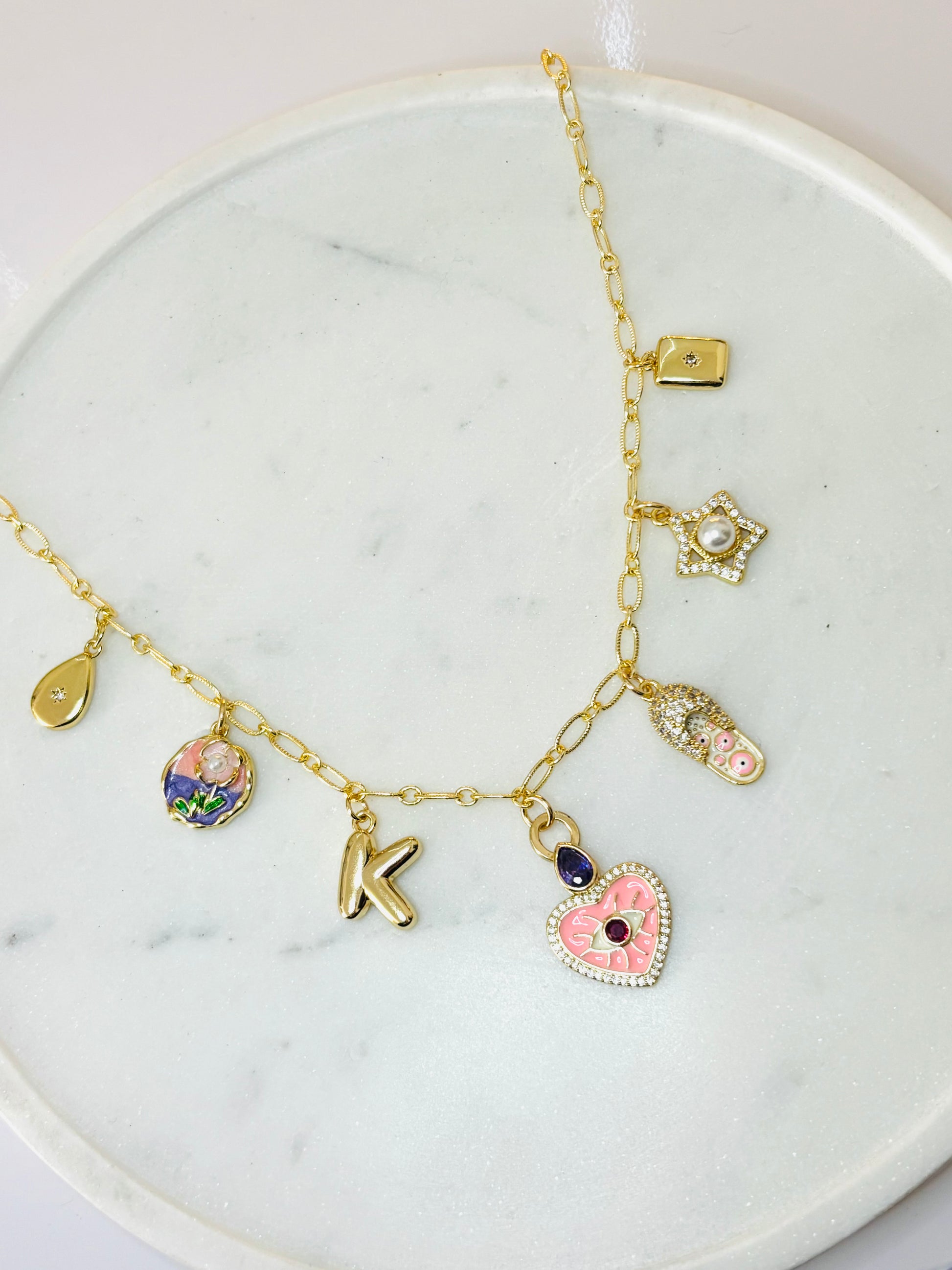 Add a playful touch of personality to your jewelry collection with our Golden Whimsy Charm Necklace from So Precious by Karem. This gold-plated chain is adorned with a charming mix of vibrant and sparkly pendants—including a pink enamel heart, a crystal-studded slipper, a pearl-accented star, and a customizable initial charm of your choice.
