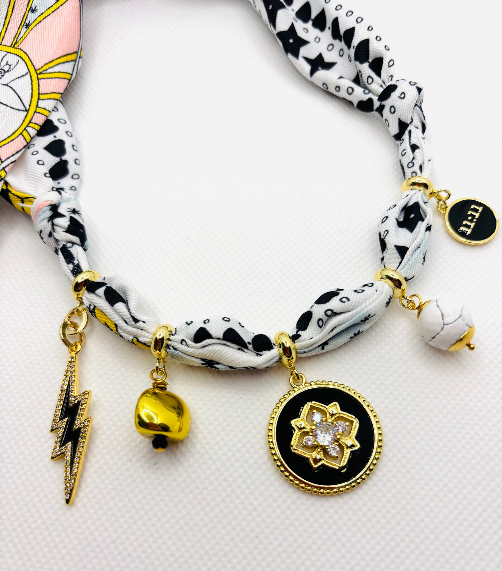 Turn heads with our Midnight Magic Scarf Charm Necklace — a bold fusion of edgy and elegant from So Precious by Karem. Featuring a silky black-and-white printed scarf with hints of soft pink and celestial design, this piece is accented with a mix of gold and black enamel charms.