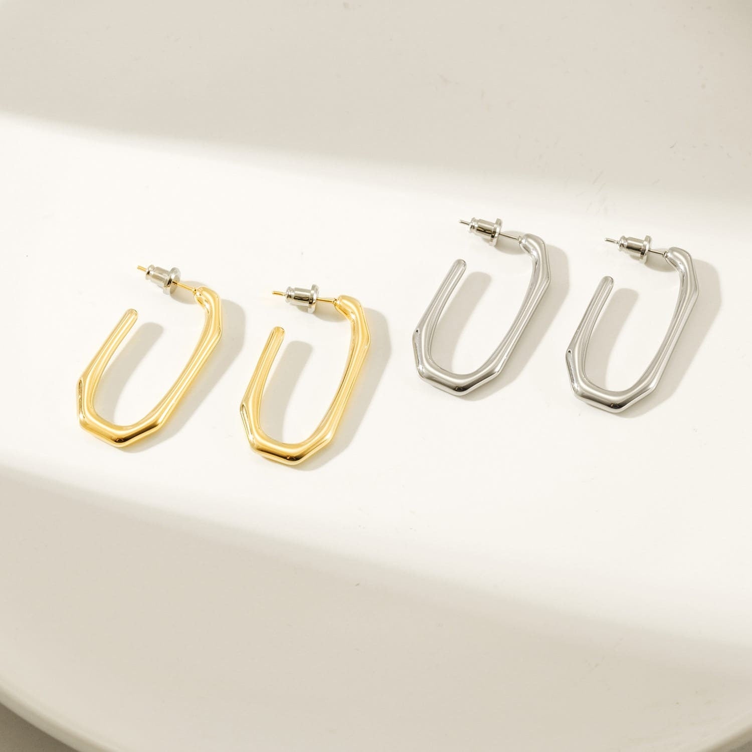 Sleek and sculptural, these geometric gold hoop earrings redefine minimalism with an edge. Featuring a distinctive angular design, they offer a bold yet refined silhouette that complements both everyday and elevated looks. Lightweight and polished to a high shine, they’re the perfect blend of contemporary style and timeless sophistication.