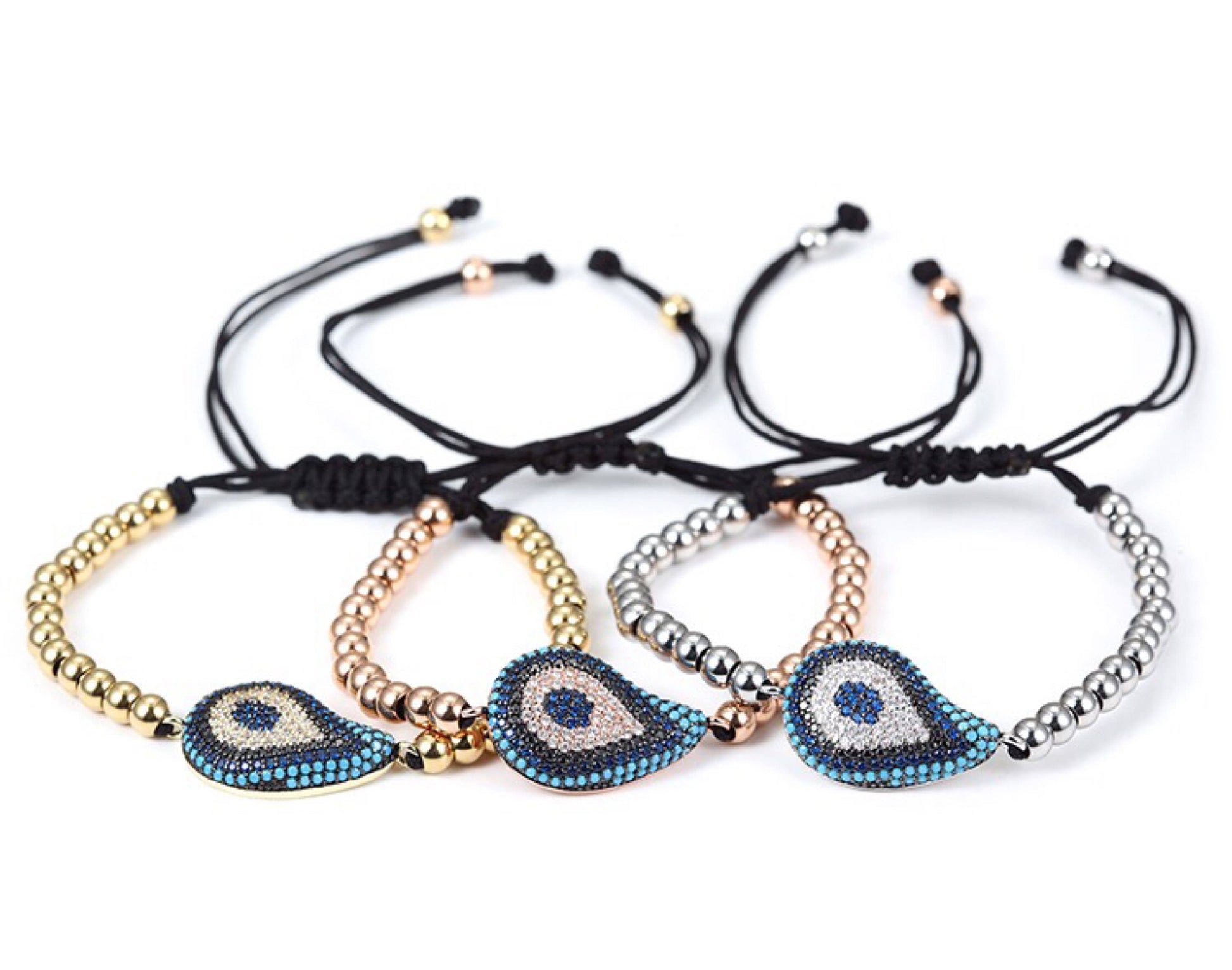 Add a pop of sparkle and protection to your stack with our Evil Eye Beaded Protection Bracelet. Featuring a dazzling teardrop-shaped evil eye charm encrusted with multicolored crystals, this bracelet is both stylish and symbolic. The metallic bead band is strung on a durable black cord with an adjustable sliding knot, making it comfortable for all wrist sizes.
